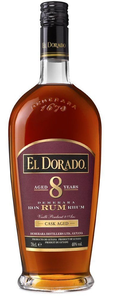 El Dorado 8 års rom är en blandning av olika romtyper, som är destillerade på både pot stills och column stills, inklusive de berömda wooden pot stills, som bidrar med djup och karaktär. Rommen lagras i minst 8 år i amerikanska ekfat, som tidigare har använts till bourbon. Doften är fyllig med noter av torkad frukt, mörk karamell, vanilj och en lätt kryddig ton av ek. Smaken är mjuk och komplex med noter av toffee, choklad, torkad frukt, kryddor och ett inslag av honung och ek.
